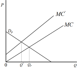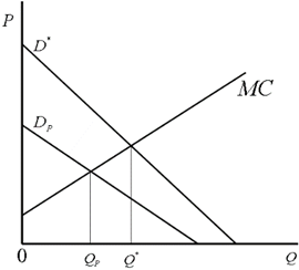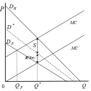 Figure 2.2 shows a general theory for eliminating market failure through positive externalities. Where, Dp is the consumer demand curve excluding the Multifunctionality of agriculture, and DH is the demand curve including Multifunctionality of agriculture. If the externalities were taken into account, the demand and supply curve proposed earlier, makes supply Qp , not the optimal social supply Q* , which leads to a decrease in producers’ output and market failure. When the government pays a subsidy or direct payment with the per unit amount of the social welfare cost S to the producer, the marginal cost curve MC for the producer will move to MC' , and then the producer’s optimal output becomes the socially optimal Q* and the market failure can be eliminated.