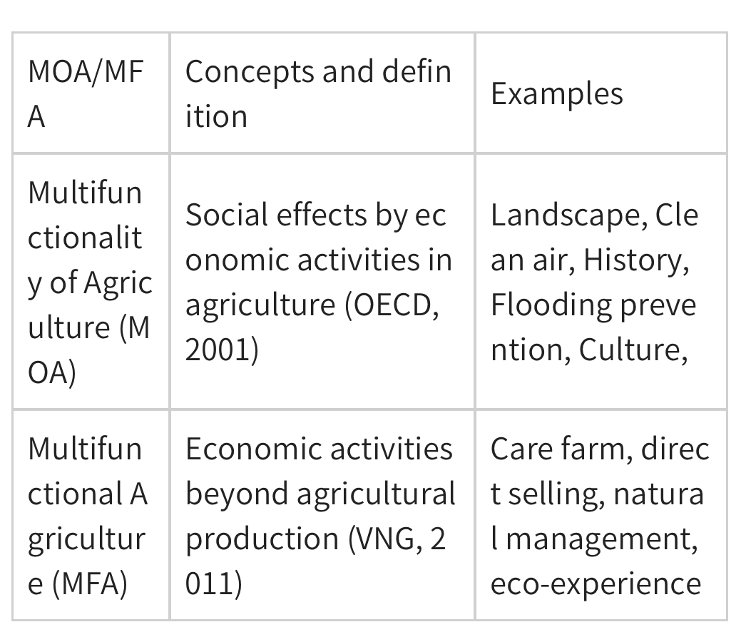 To summarize, Multifunctionality of agriculture is an external effect that occurs in agricultural production activities or rural space, and the external effect is characterized by non-realness and non-exclusivity from consumers. Therefore, this effect can be used by anyone without payment. Meanwhile, Multifunctional agriculture is a program or some practical activities that convert the Multifunctionality of agriculture into economic income.